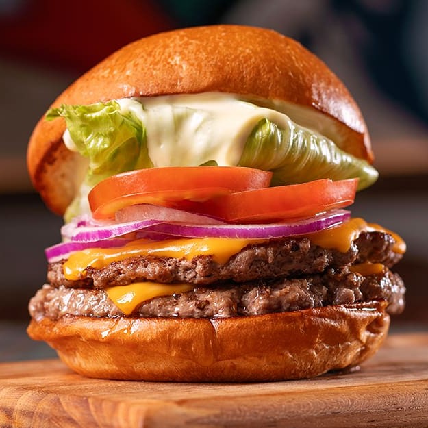 2x hambúrgueres bovinos de 90g temperados com nosso dry rub, queijo cheddar, alface, tomate, cebola roxa cortada fininha e maionese clássica no pão brioche.