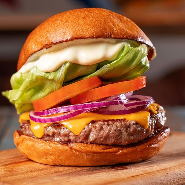Hambúrguer bovino de 150g (alto) temperados com nosso dry rub, queijo cheddar, alface, tomate, cebola roxa cortada fininha e maionese clássica no pão brioche.