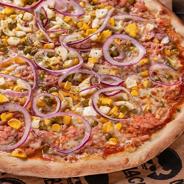 Presunto, milho, ervilha, ovos, cebola roxa, muçarela, molho de tomate caseiro com toque de manjericão, massa artesanal de longa fermentação, orégano e azeitonas