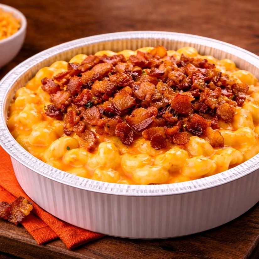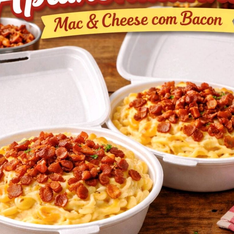 São 2 Mac & Cheese super cremosos, com massa no ponto certo, molho de queijo encorpado e bacon crocante que dá aquele toque defumado irresistível.
