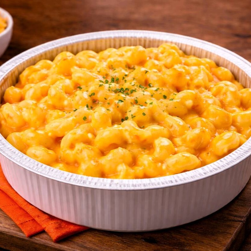 Macarrão no ponto certo envolvido em molho cremoso de cheddar, com sabor marcante e textura irresistível.