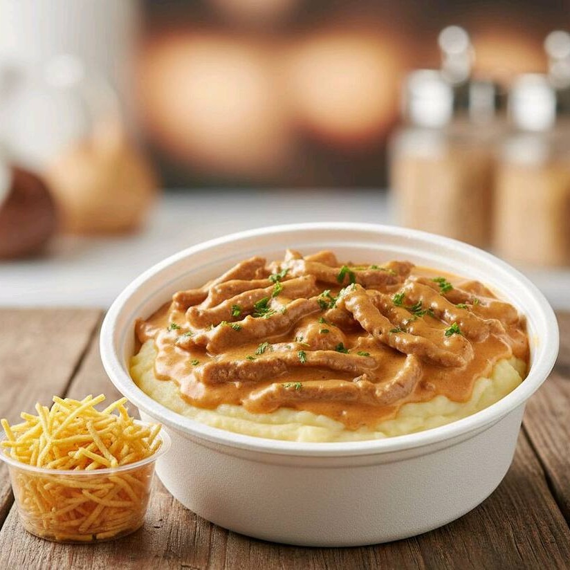 Duas batatas recheadas cremosas, generosamente cobertas com strogonoff de carne macio, molho bem encorpado e sabor marcante.