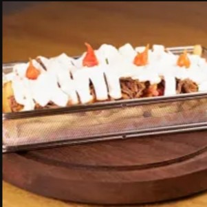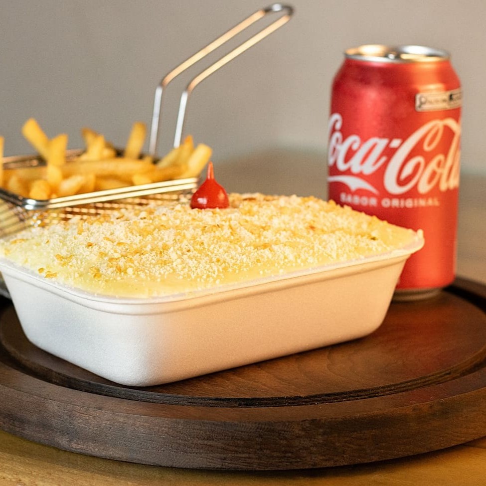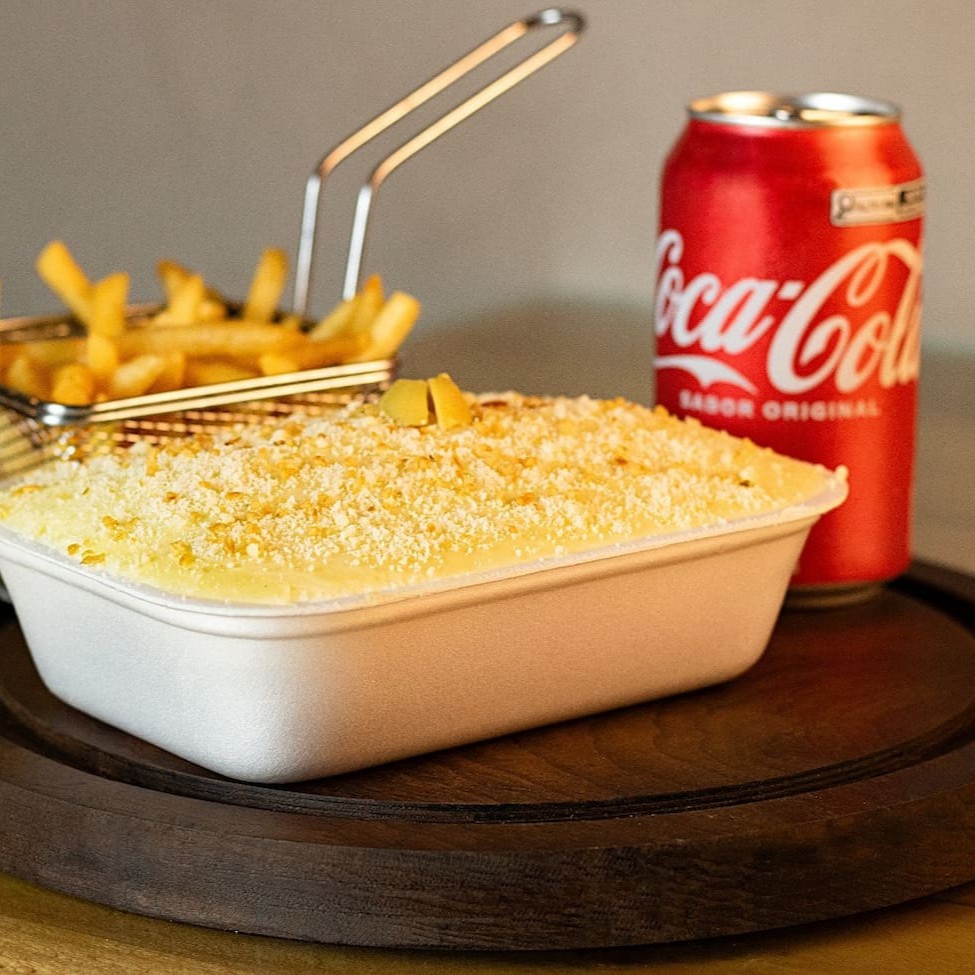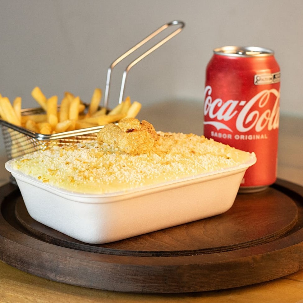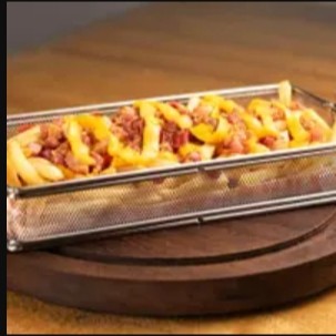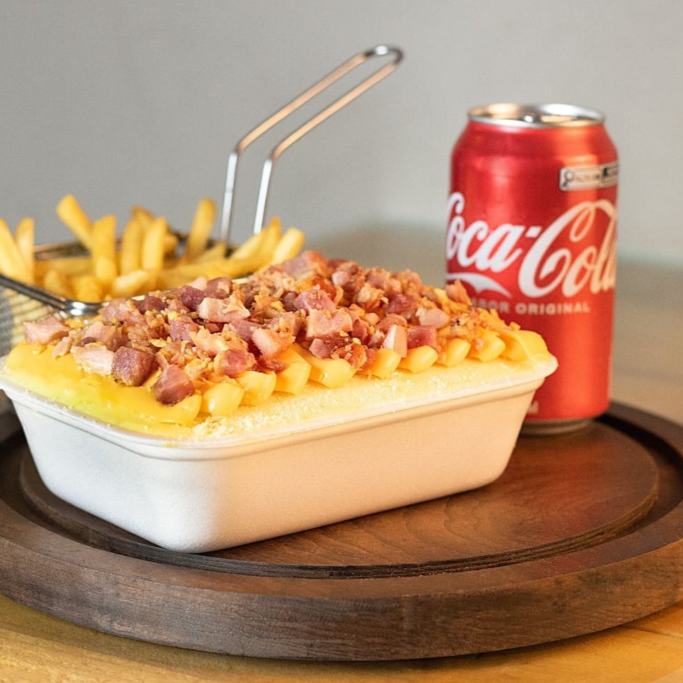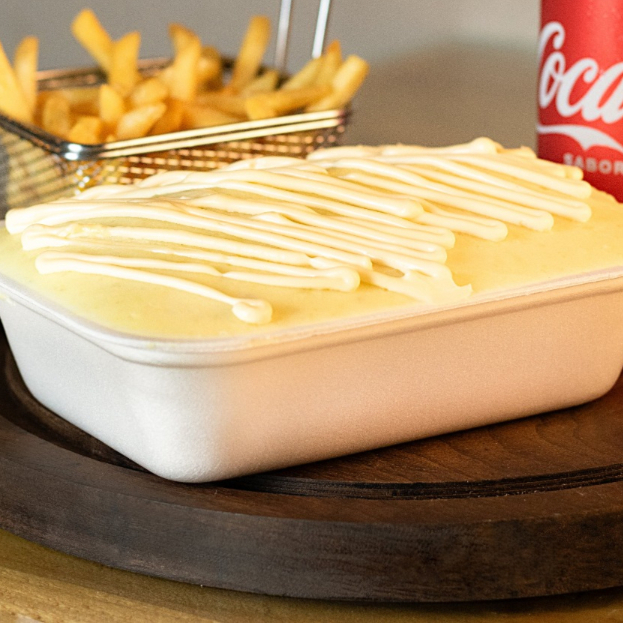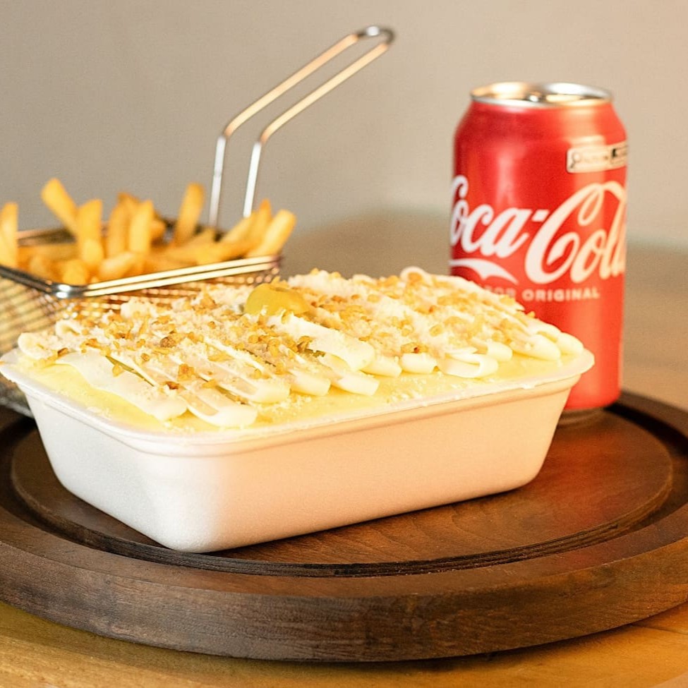 Esse prato, vai 350g de batata frita, 180g de carne desfiada, queijo mussarela, cream cheese e pimenta