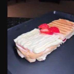 pão brioche caramelo, nutella empanada na farinha panco, creme de leite ninho, morango, leite ninho polvilhado em cima