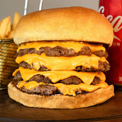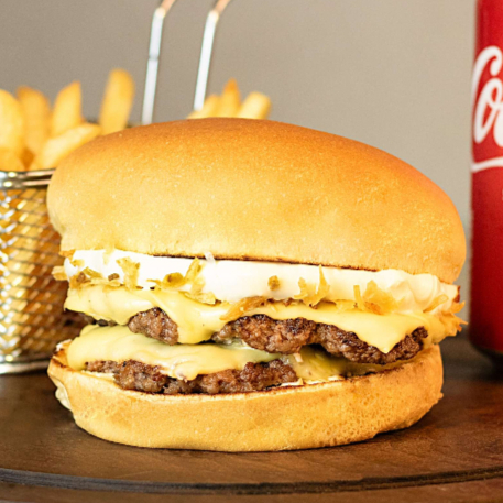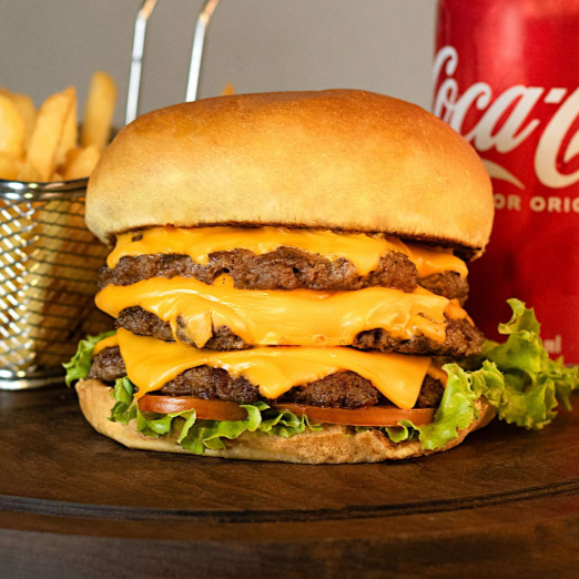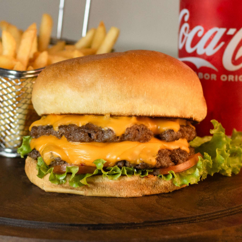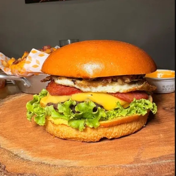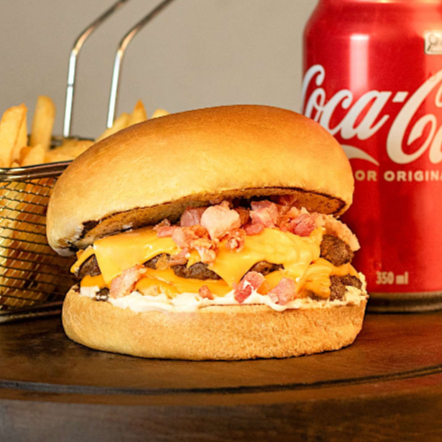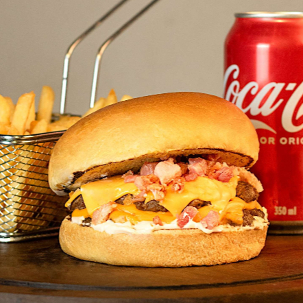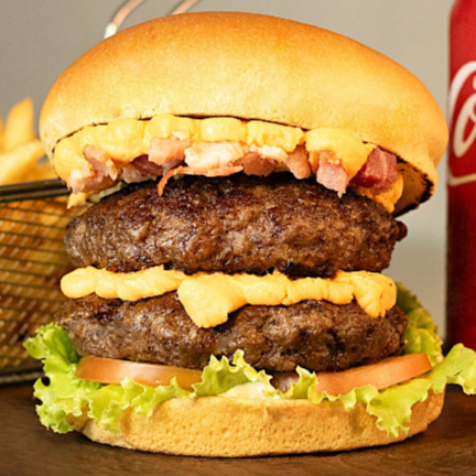 Pão de brioche, dois hambúrgueres suculentos de 160g, maionese, tomate, alface, queijo cheddar cremoso, bacon.