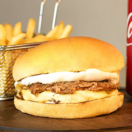 Pão, hamburger smash 80g, maionese, queijo mussarela, cream cheese, costela desfiada, alface e tomate