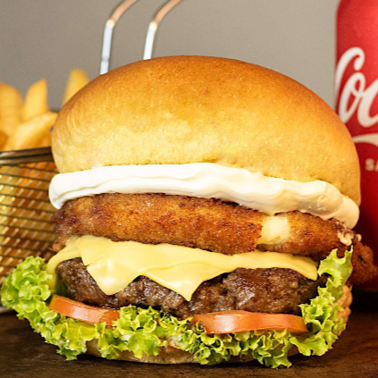 Pão de brioche, hambúrguer suculento de 160g, maionese, tomate, alface, cream cheese, queijo empanado, queijo mussarela.