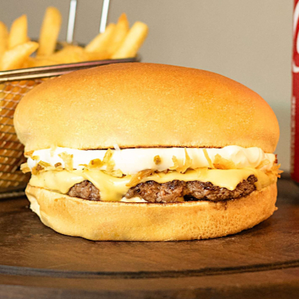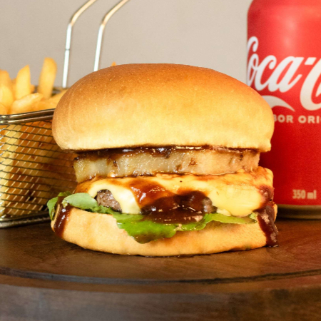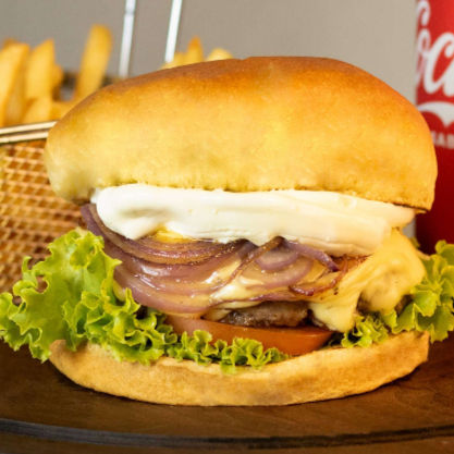 Pão de brioche, hambúrguer suculento de 160g, maionese, tomate, rúcula, barbecue, bacon, anéis de cebola, queijo prato.
