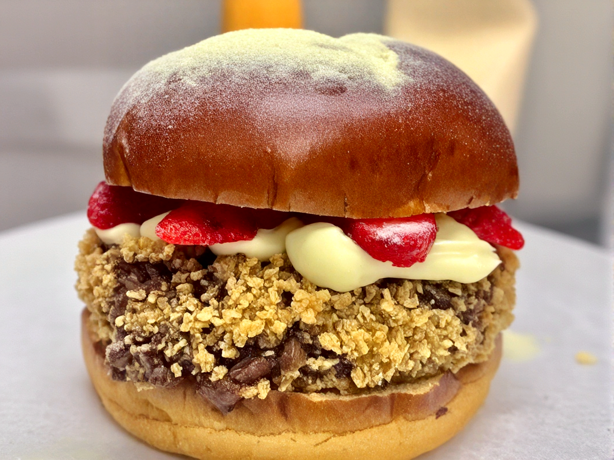 Pão de brioche, filé de frango empanado, cream cheese, maionese, tomate, alface e cebola roxa.