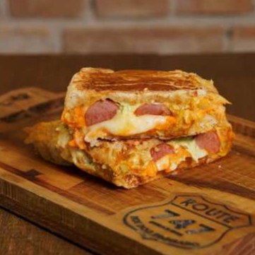 Pão, salsicha, milho, vinagrete, batata palha, mussarela, purê de batata, carne de panela levemente apimentada, cream cheese