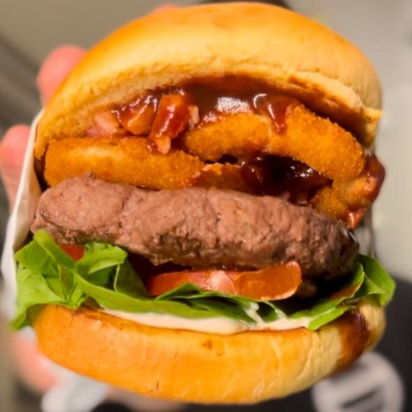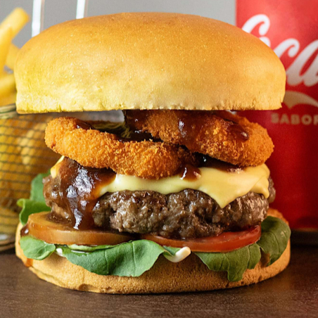 Pão de brioche, hambúrguer suculento de 160g, maionese, tomate, rúcula, barbecue, onion rings, queijo mussarela.