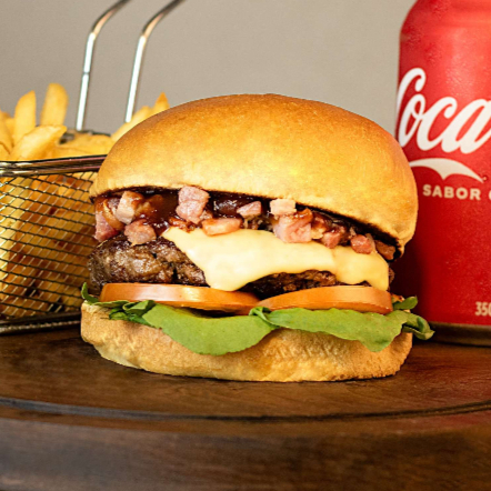 Pão de brioche, hambúrguer suculento de 160g, maionese, tomate, rúcula, barbecue, bacon, queijo mussarela.