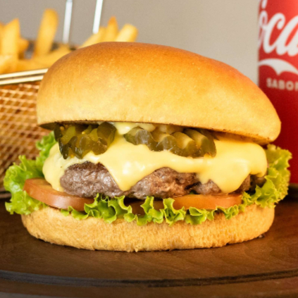 Pão de brioche, hambúrguer suculento de 160g, maionese, picles, tomate, alface, queijo mussarela.