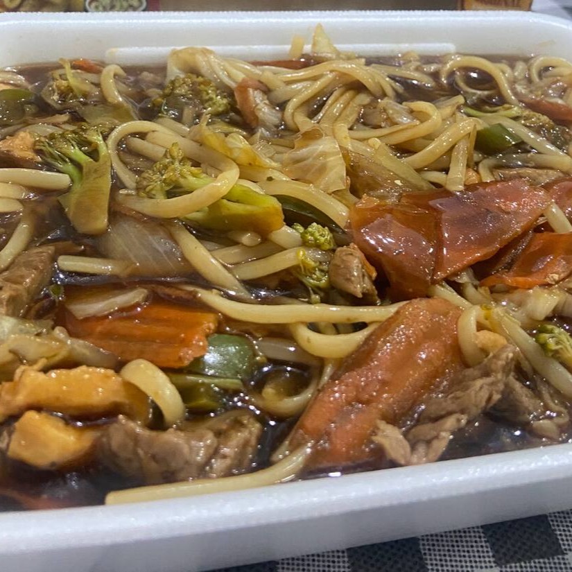 Macarrão Yakisoba, tiras de carne, tiras de frango, cebola, cenoura, repolho, brócolis, pimentão e molho shoyu - aprox. 1 kilo