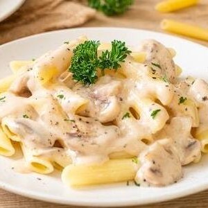 Macarrão Penne servido com molho branco, preparado com temperos selecionados e finalizado. Porção de 500g.