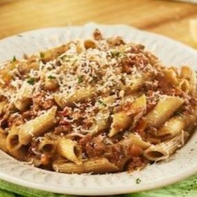 Macarrão Penne servido com molho à bolonhesa clássico, preparado com carne e temperos selecionados. Porção de 500g.