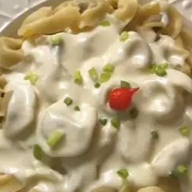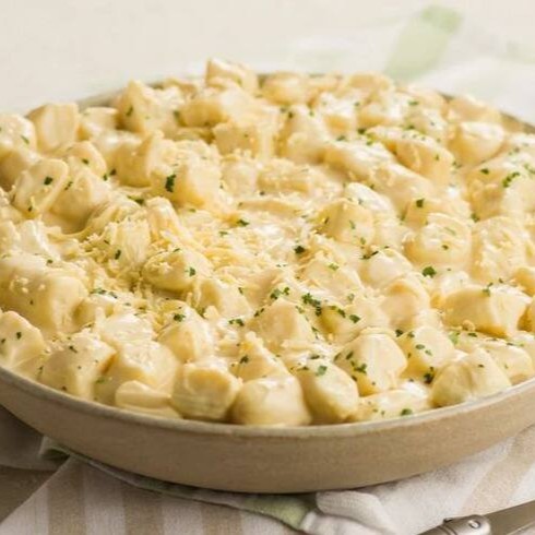 Ravioli de 4 queijos coberto com molho branco cremoso, finalizado com bacon crocante, alho frito e cheiro-verde. Porção de 500g.