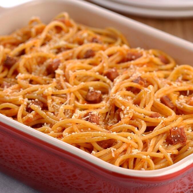 Macarrão espaguete ao molho vermelho com calabresa ao cubo e cheiro verde.