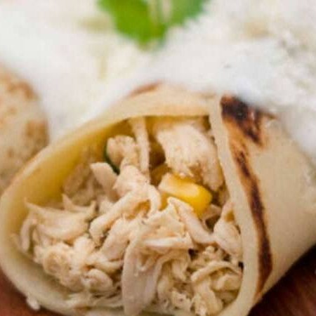 2 Panquecas com frango desfiado com requeijão cremoso e molho branco, acompanhado de uma porção de batata palha crocante.
