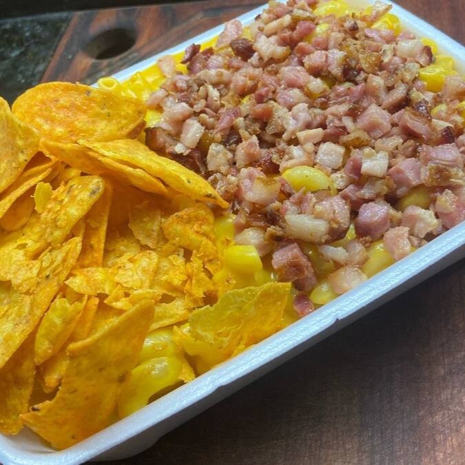 Macarrão caracolino com molho cheddar cremoso e mussarela derretida, coberto com bacon crocante e acompanhado de Doritos em embalagem individual. Aproximadamente 900g.