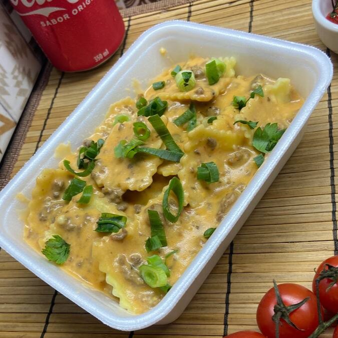 Ravioli de carne com molho à bolonhesa e finalizado com mussarela derretida. Porção de 500g.