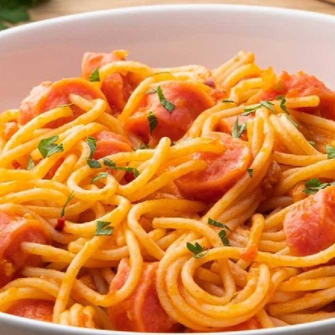 Macarrão espaguete com molho de tomate artesanal, salsicha fatiada e toque de cheiro-verde fresco.