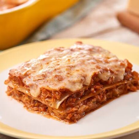 Massa de lasanha, frango desfiado refogado ao molho vermelho, presunto e mussarela.