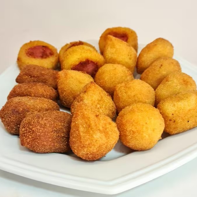 Mini Salgados Fritos' é uma generosa oferta de 30 irresistíveis mini salgados, perfeitamente fritos e crocantes. Nele, você encontrará uma incrível variedade, incluindo as tradicionais coxinhas, saborosas combinações de presunto e queijo, autênticas bolinhas de queijo, deliciosos enroladinhos de salsicha, tentadoras porções de calabresa, suculentos salgados de milho com requeijão, exóticos kibes, irresistíveis croquetes, robustos salgados de carne e os sempre amados salgados de requeijão. Uma verdadeira festa de sabores para o seu paladar, que promete deixar qualquer ocasião mais especial!