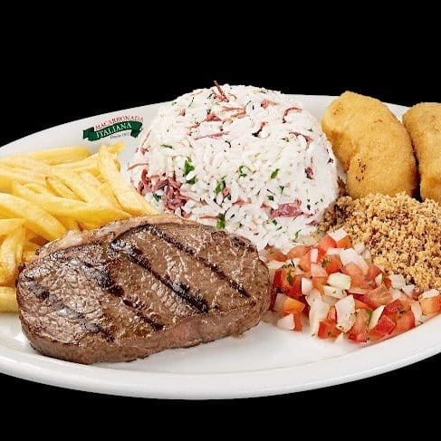 Contrafilé grelhado no ponto certo, com sabor e suculência garantidos. Ideal para quem aprecia uma refeição saborosa, com aquele gostinho especial de carne bem preparada. Acompanha arroz branco ou carreteiro, vinagrete, fritas, farofa, banana frita e salada de rúcula.