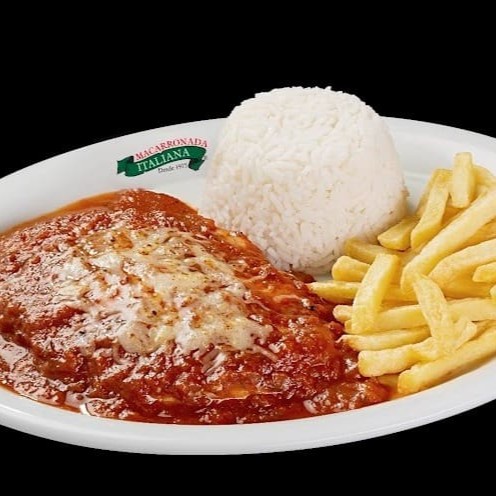 Filé mignon empanado e coberto com molho de tomate especial e queijo derretido, servido com arroz soltinho e batata frita crocante. Uma refeição clássica e irresistível para quem ama sabor e qualidade!