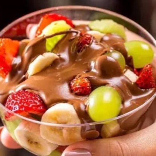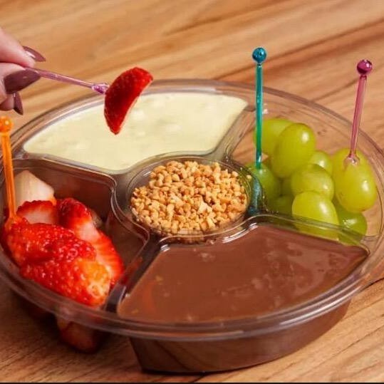 Delicioso Fundue na tigela de 300ml, acompanha Banana, Morango e Uva com uma generosa calda de Chocolate ao leite.