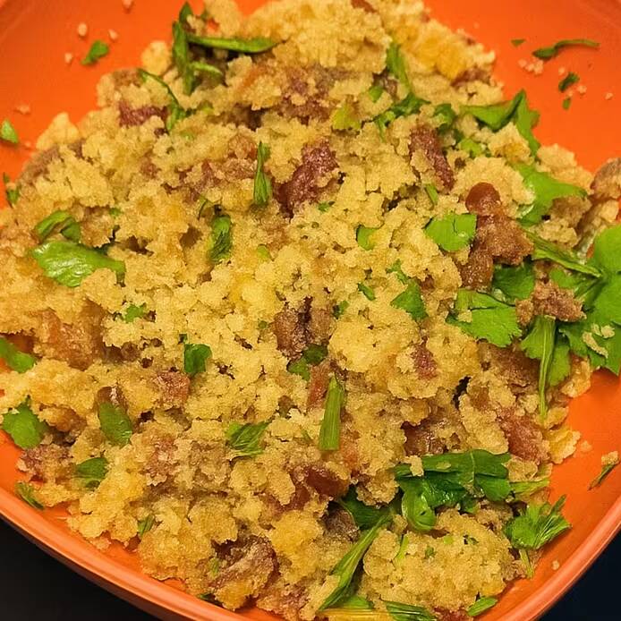 250 ml de Porção de farofa magnífica molhadinha da casa. Linguiça calabresa, cebola, farinha de mandioca em flocos, cebola picadinha, cheiro verde picadinho e alho ralado