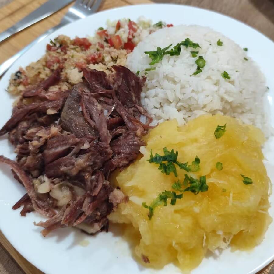 750g de Costela no bafo desfiando + 500 ml de arroz soltinho + 500 ml de mandioca na manteiga derretendo + 250 ml de farofa molhadinha deliciosa + 250 ml de vinagrete do Chef