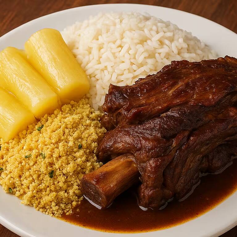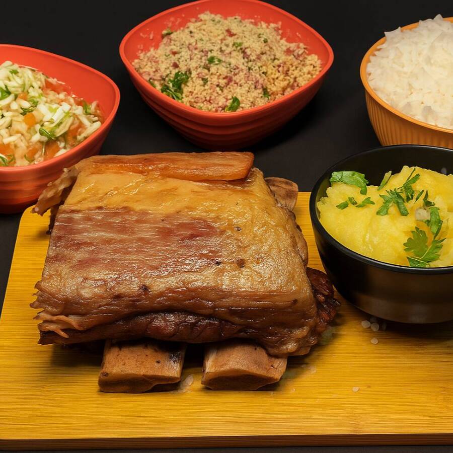 Costela bovina assada lentamente até desmanchar no molho do próprio cozimento. Uma refeição generosa, ideal para quem quer matar a fome com prazer e sustância.