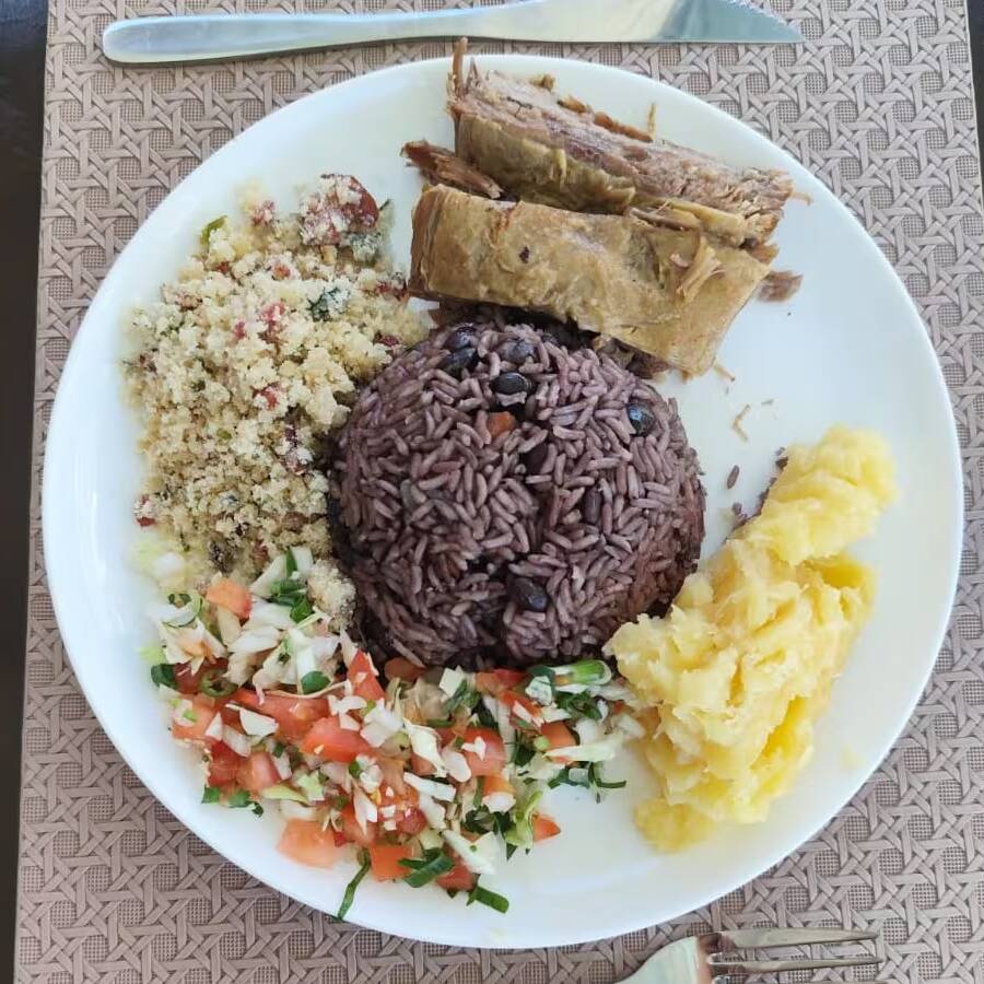 Prato Feito Executivo versão Mini de Arroz Congris Magnífico (arroz, feijão preto, especiarias e carne suina, acompanhado de mandioca magnífica na manteiga que derrete, farofa magnífica molhadinha , vinagrete magnífica do Chefe e costela magnífica no bafo que desfia.