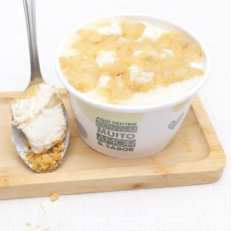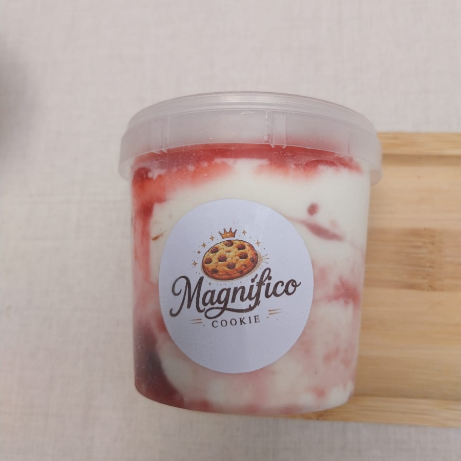 Sorvete feito artesanalmente com leite ninho e geleia de morango, embalagem de 220ml
