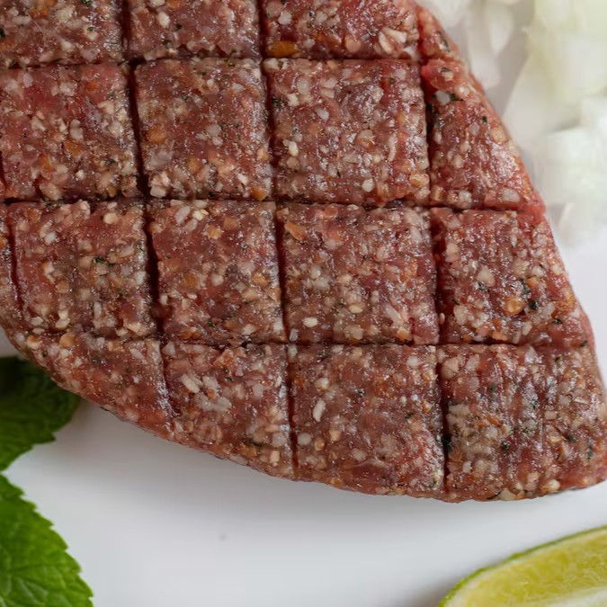 Nosso kibe cru é feito com cortes nobres e delicadamente limpos para que a carne, vermelhinha, possa ser moída com o trigo descansado, cebolinha e hortelã. Acompanha cebola picada.