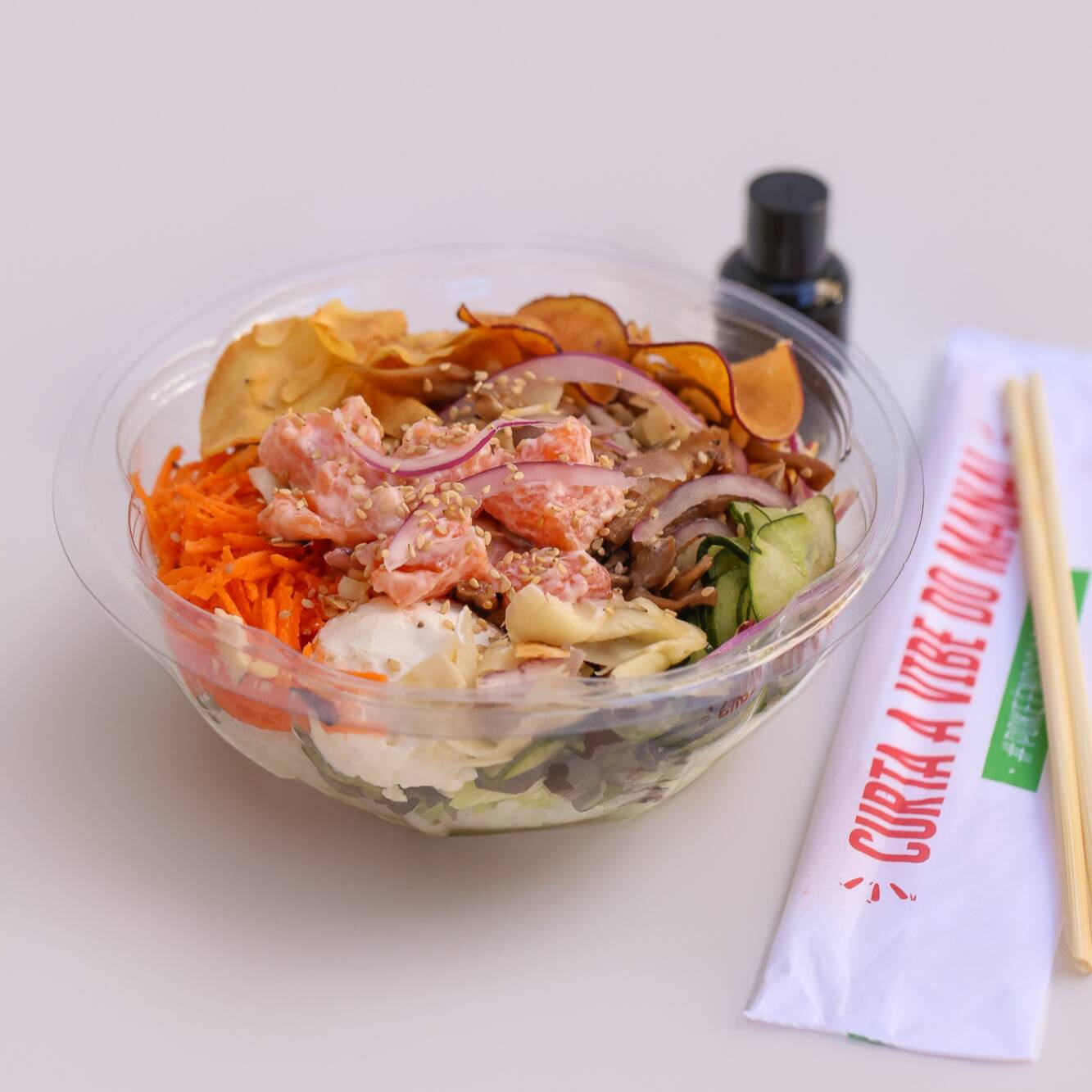 Arroz japonês, mix de folhas, sunomono, cenoura, cream cheese, chips de batata-doce, chips de mandioca, salmão com cream cheese, shimeji, amêndoa laminada, cebola roxa, gengibre e gergelim. Acompanha molho tarê