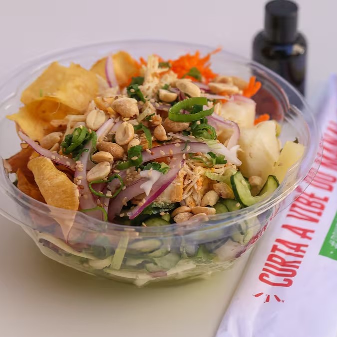 Espaguete de abobrinha, mix de folhas, abacaxi, cenoura, sunomono, chips de mandioca, chips de batata-doce, frango desfiado, amendoim, cebola roxa, cebolinha e gergelim. Acompanha molho shoyo.