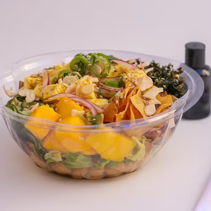 Grão de bico, mix de folhas, edamame, sunomono, manga, chips de batata doce, couve crispy, tofu orgânico, amêndoas, cebolinha, gergelim e cebola roxa. Acompanha molho ponzu.