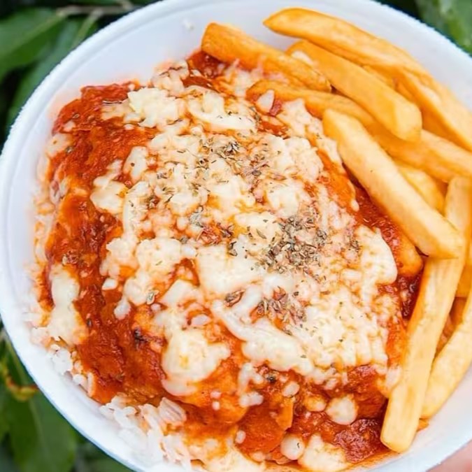 Deliciosa Parmegiana de Frango com Fritas, acompanha : arroz branco, frango parmegiana e batata frita.