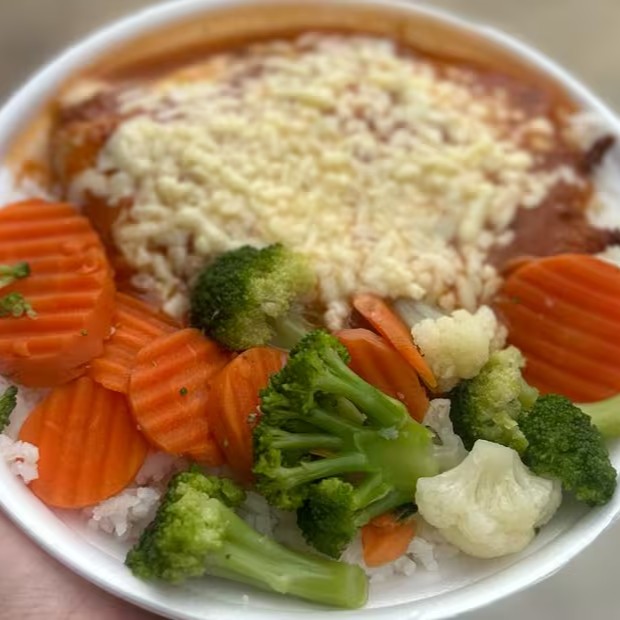 Deliciosa Parmegiana de Frango com Legumes, acompanha : arroz branco, frango parmegiana e legumes + Coca Cola Original 200ml