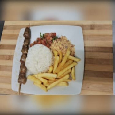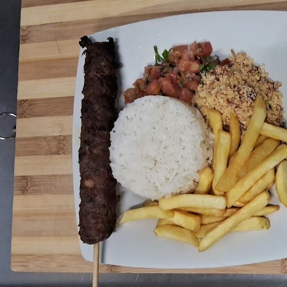 Arroz bem temperadinho, farofa de bacon,vinagrete e batata frita com espeto de Kafta