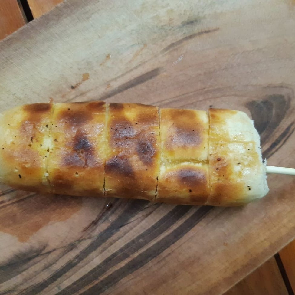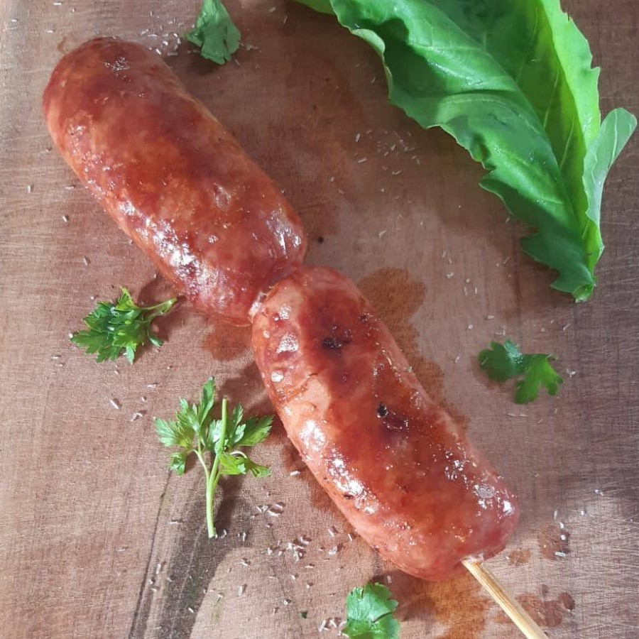 Um lanchinho maroto de pão francês, espetinho de linguiça rúcula,vinagrete,maionese temperada, molhos de barbecue e aquele molho especial.