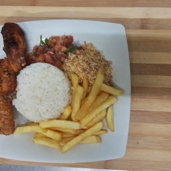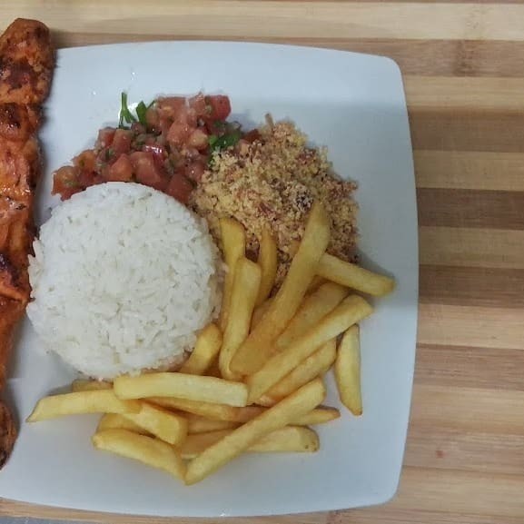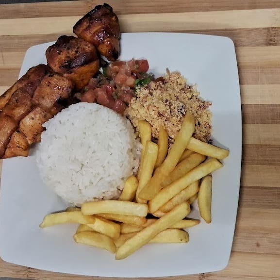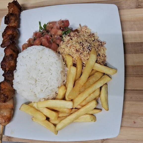 Arroz bem temperadinho, farofa de bacon,vinagrete e batata frita com espeto de frango