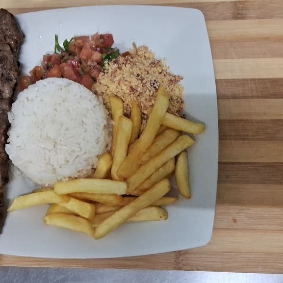 Arroz bem temperadinho, farofa de bacon,vinagrete e batata frita com espeto de medalhão