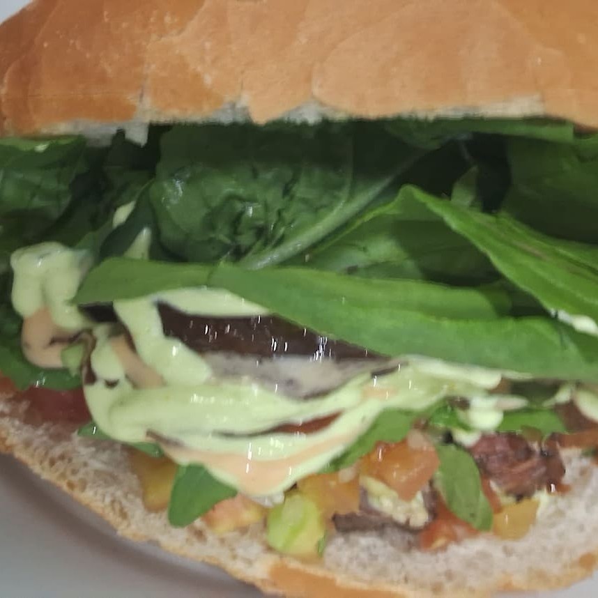 Um lanchinho maroto de pão francês, espetinho de carne,rúcula,vinagrete,maionese temperada, molhos de barbecue e aquele molho especial.