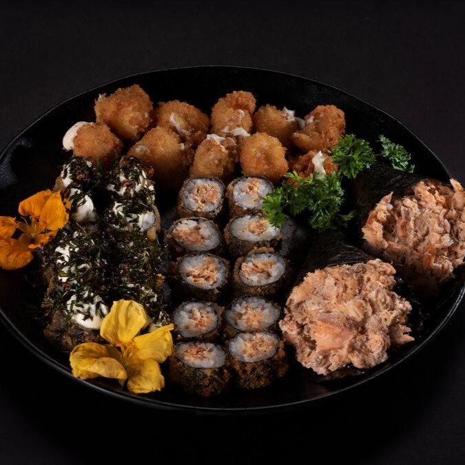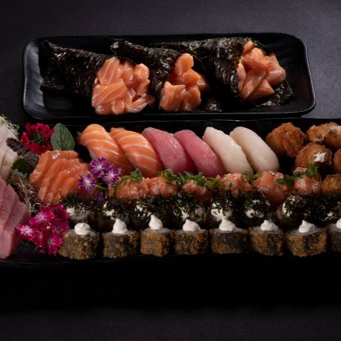 64 Peças (Serve até 2 pessoas, acompanha: 2 salmão grelhado, 4 bolinha de salmão empanado e frito, 4 mini pastel de patê de salmão, 4 mini harumaki de queijo, 2 mini temaki de 0,80gr de salmão cru com cream cheese e cebolinha, 6 mini hot holl, 6 salmão empanado ( empanado sil) , 0,270gr de camarao na manteiga, 0,200gr de ceviche do chefe, 0,200gr de shimeji, 5 sashimi de atum, 5 sashimi de salmão, 5 sashimi de peixe branco, 2 niguiri de atum, 2 niguiri de salmão, 2 niguiri de tilápia , 4 jhow de Doritos, 4 uramaki, 4 hossomaki)