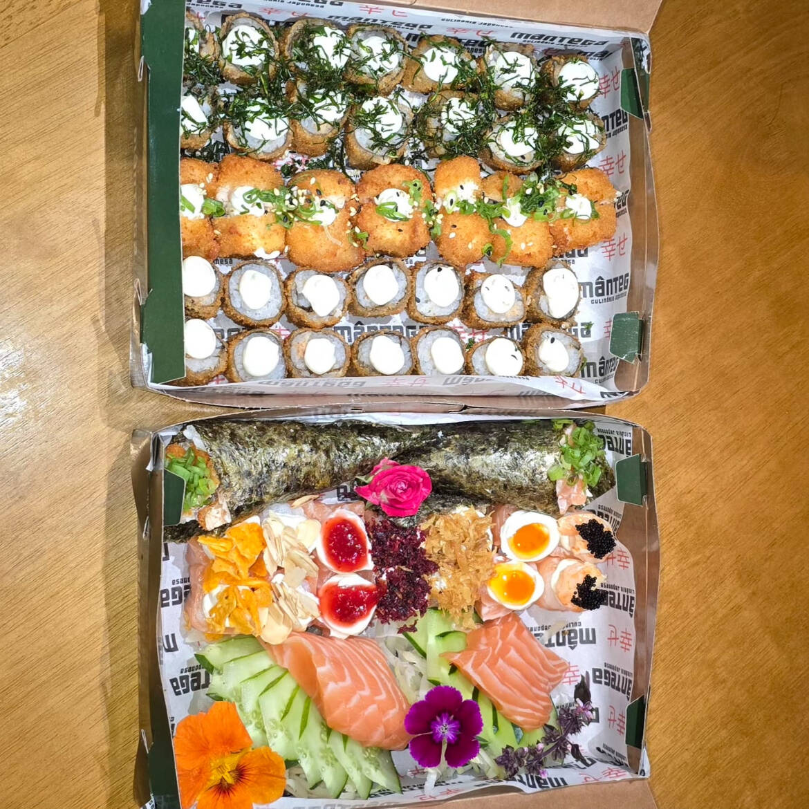 45 peças (12 sashimis / 6 niguiris / 6 hot rolls / 6 Mini hot / 6 empanado Sil/ 6 Jhows salmão / 3 mini temakis de 80gr de salmão cru cream cheese e cebolinha)