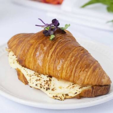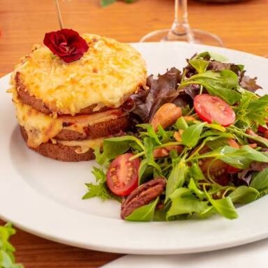 Sanduíche no brioche com presunto, queijo gruyère e molho bechamel, gratinado com parmesão. Acompanha batata frita ou salada.